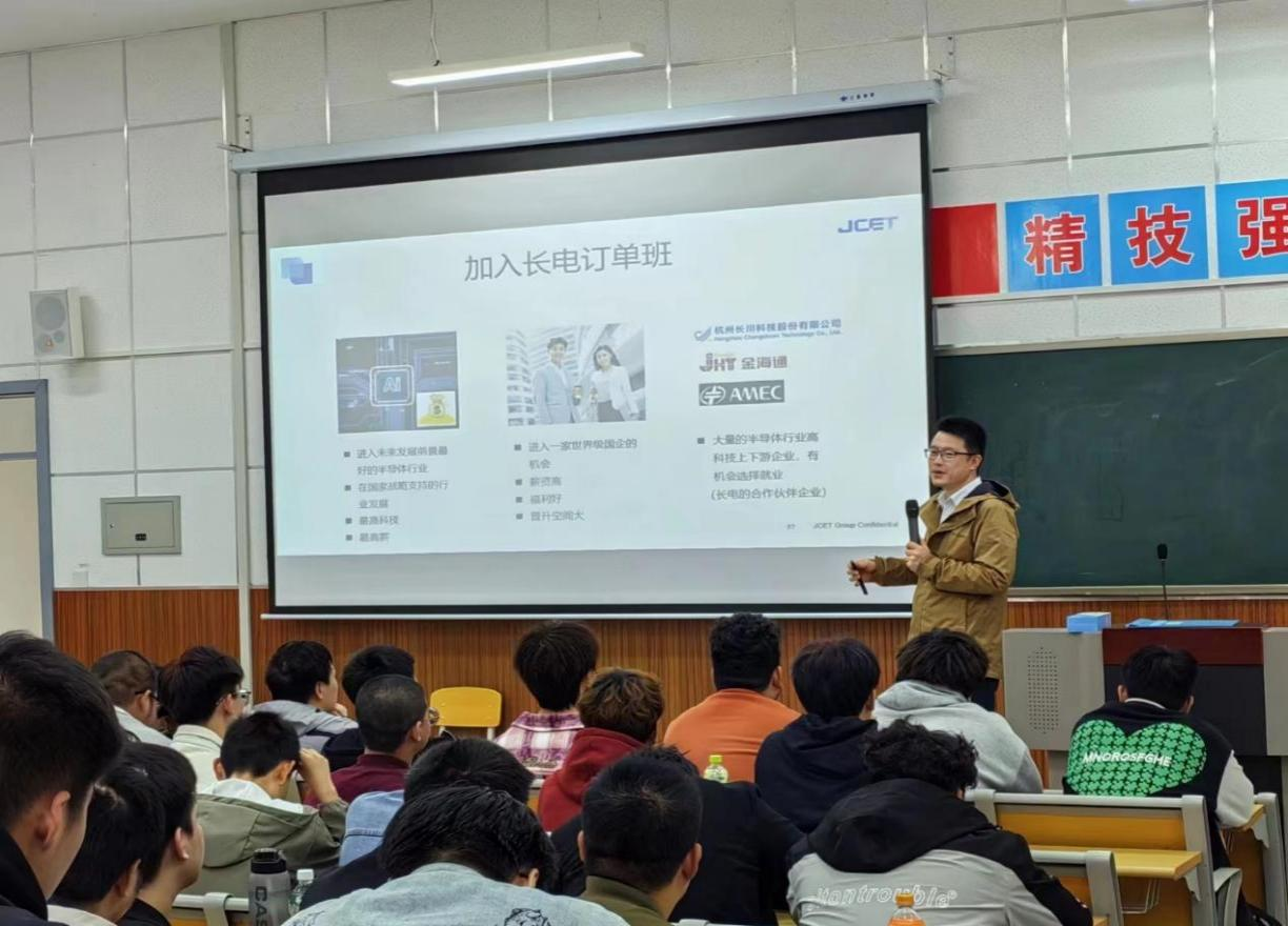 宣讲会现场,企业校招部总监陆洁齐通过播放企业宣传片和PPT的形式向同学们介绍了企业的基本情况,江苏长电科技股份有限公司是国内排名第一首家半导体封测国有控股上市公司,位居全球同行业第三位,一直以骄人的业绩领跑国内同行企业,公司拥有先进的技术和设备,致力于为客户提供高质量的产品和服务。为了满足公司业务不断发展的需求,此次专场宣讲会主要招聘生产管理员、储备维修工程师、储备制程工程师等岗位,在生产过程中学习设备维修等相关知识,掌握机械自动化设备等实践知识,强化员工专业知识应用及专项技能,为员工顶岗实习乃至未来的工作打下坚实的基础。针对订单班,公司安排专人进行管理及员工辅导,有工程师进行专业技术指导教学。